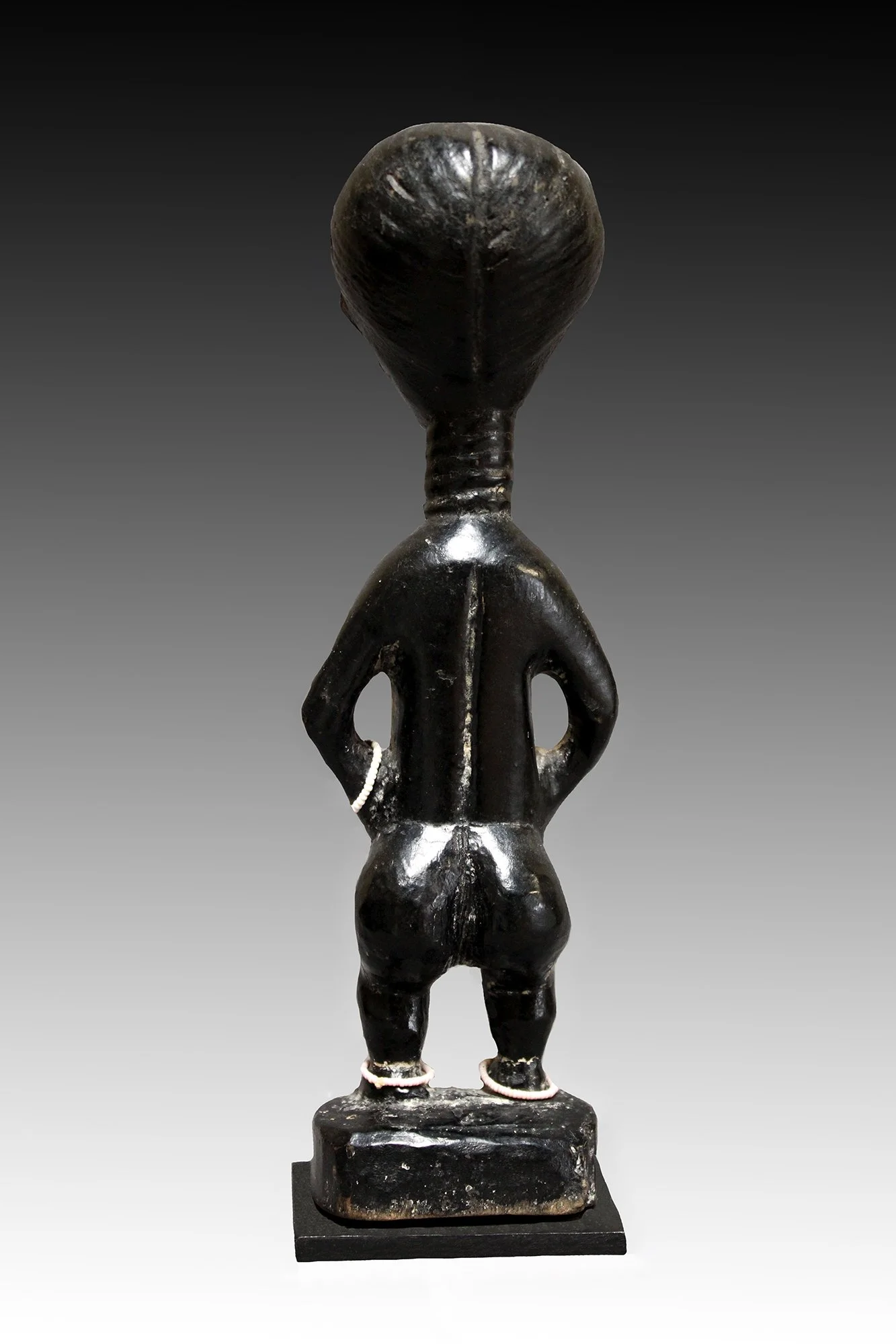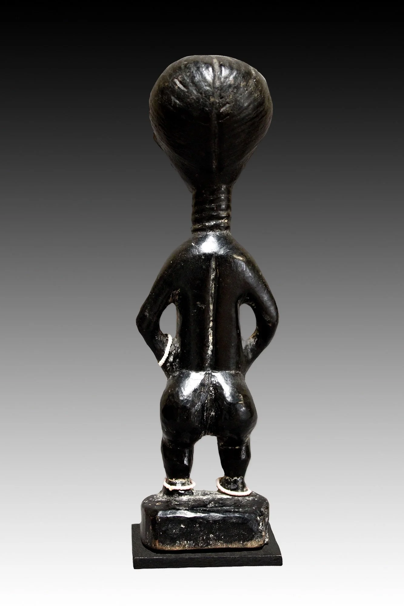 Akan figures were carved with the ideal of elegance and beauty. These figures were used in mediation with spirits kept in an altar or shrine. The female figure has a glossy black patina with a domed head, ringed neck, pointy breasts and has beaded anklets and bracelet.