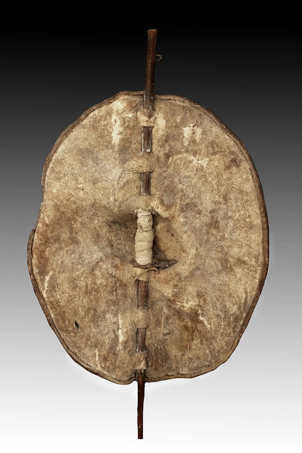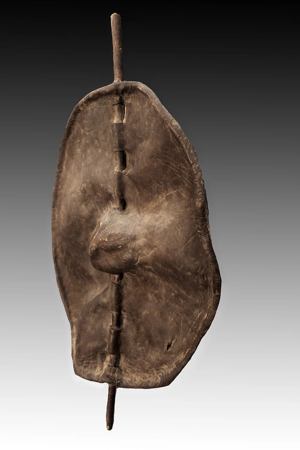 The Dinka live in the region of the upper white Nile in Southern Sudan. This Dinka shield is made of buffalo hide with an oval body and raised boss at the center, threaded down the length of a wooden pole. The pole acts as a support and a handle grip.