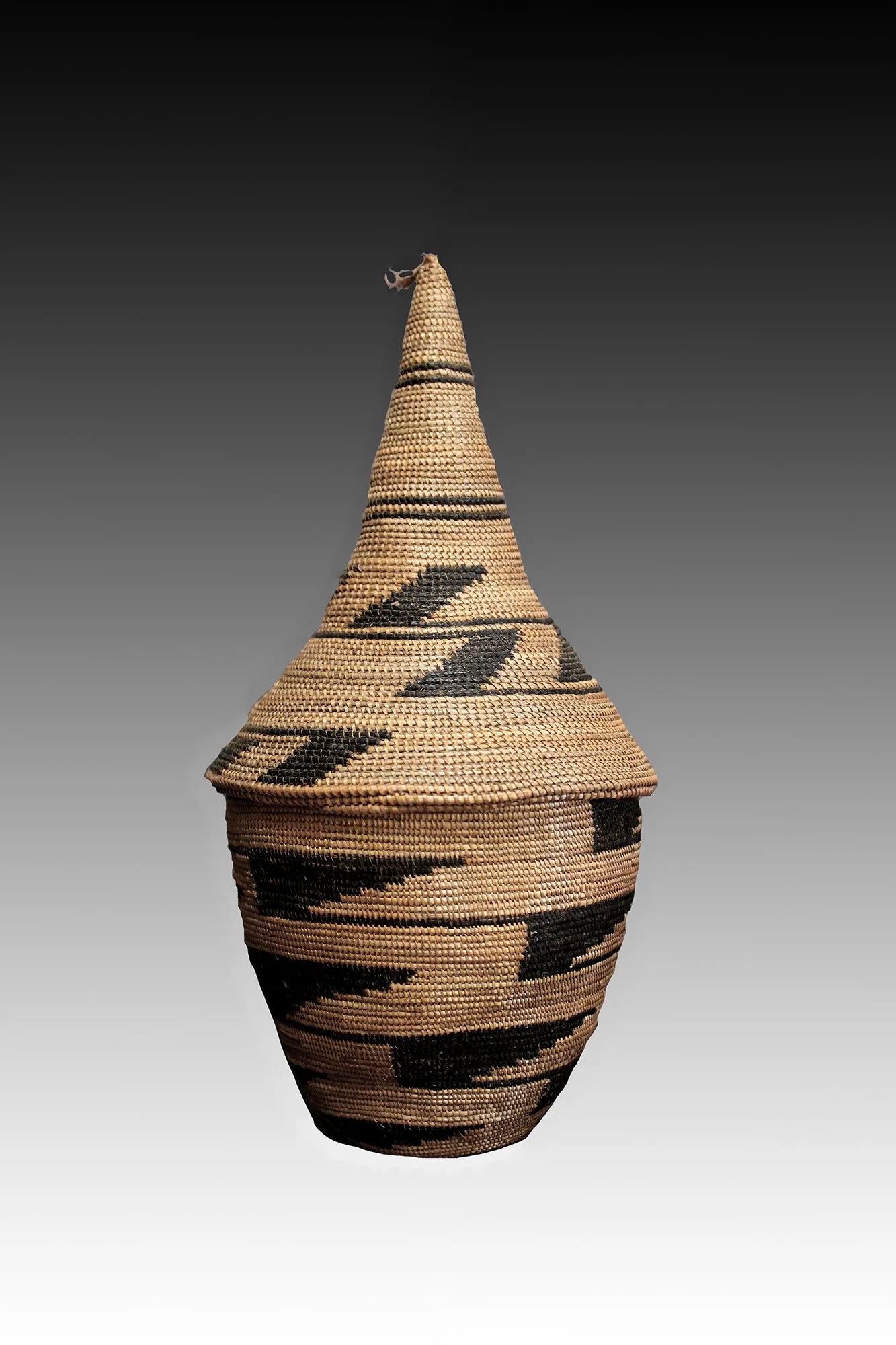 Tutsi women of the ruling class created finely coiled baskets with cone shaped lids called Agaseki. These refined baskets were made of natural fibers of sisal and papyrus trees with a golden color incorporating zig-zag and triangle designs of natural dyes.