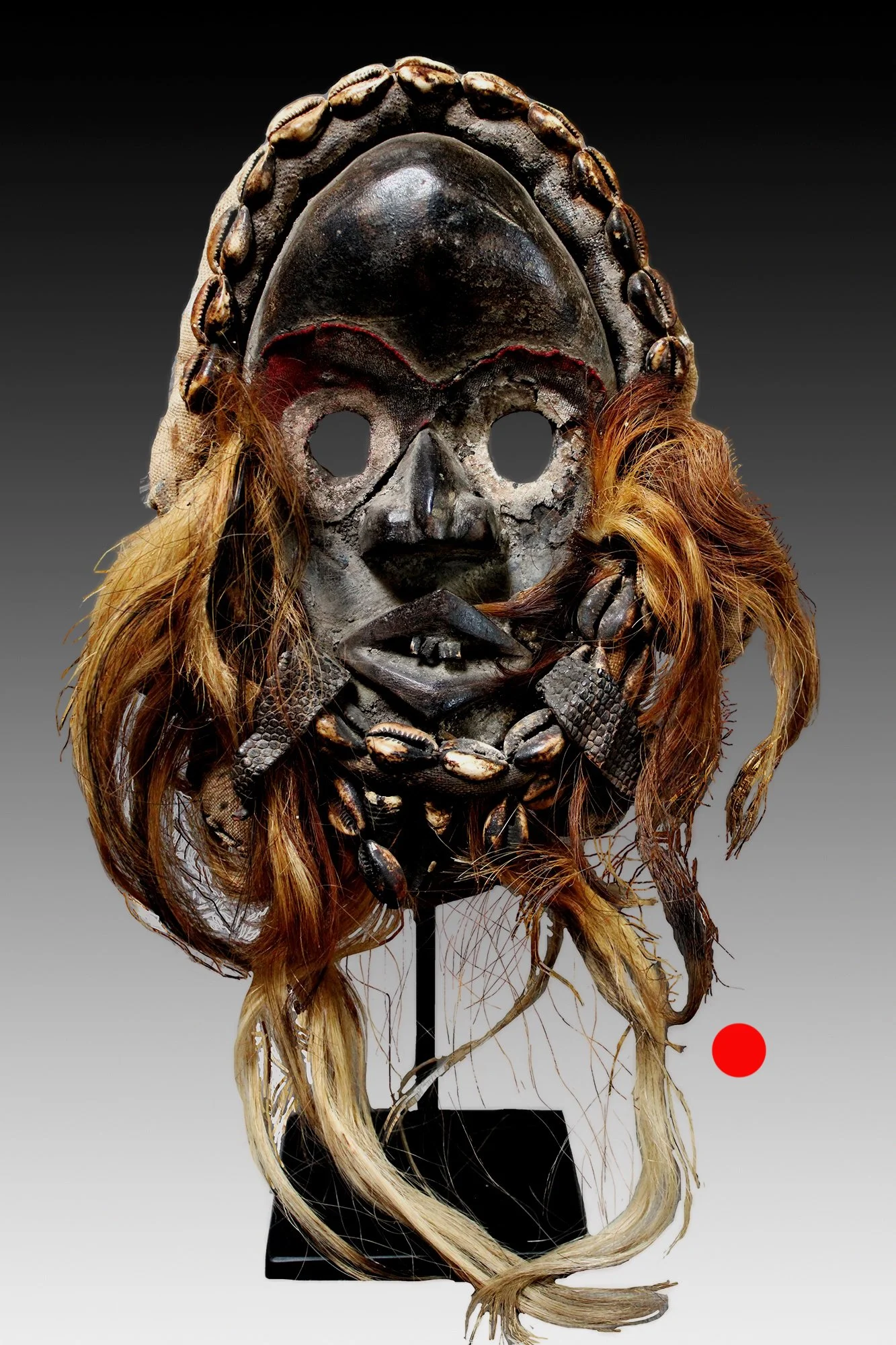 The Dan Zakpai is a fire prevention mask from the northern savanna of the Dan The fastest runner of the village are selected to report fires to the people in the surrounding areas. The Zakpai dancers aggressively ensure that women extinguish their cooking fires before the afternoon winds blow. The wooden mask is decorated with burlap bundles, cowrie shells, animal hair, reptile skin, metal teeth and remnants of red fiber.