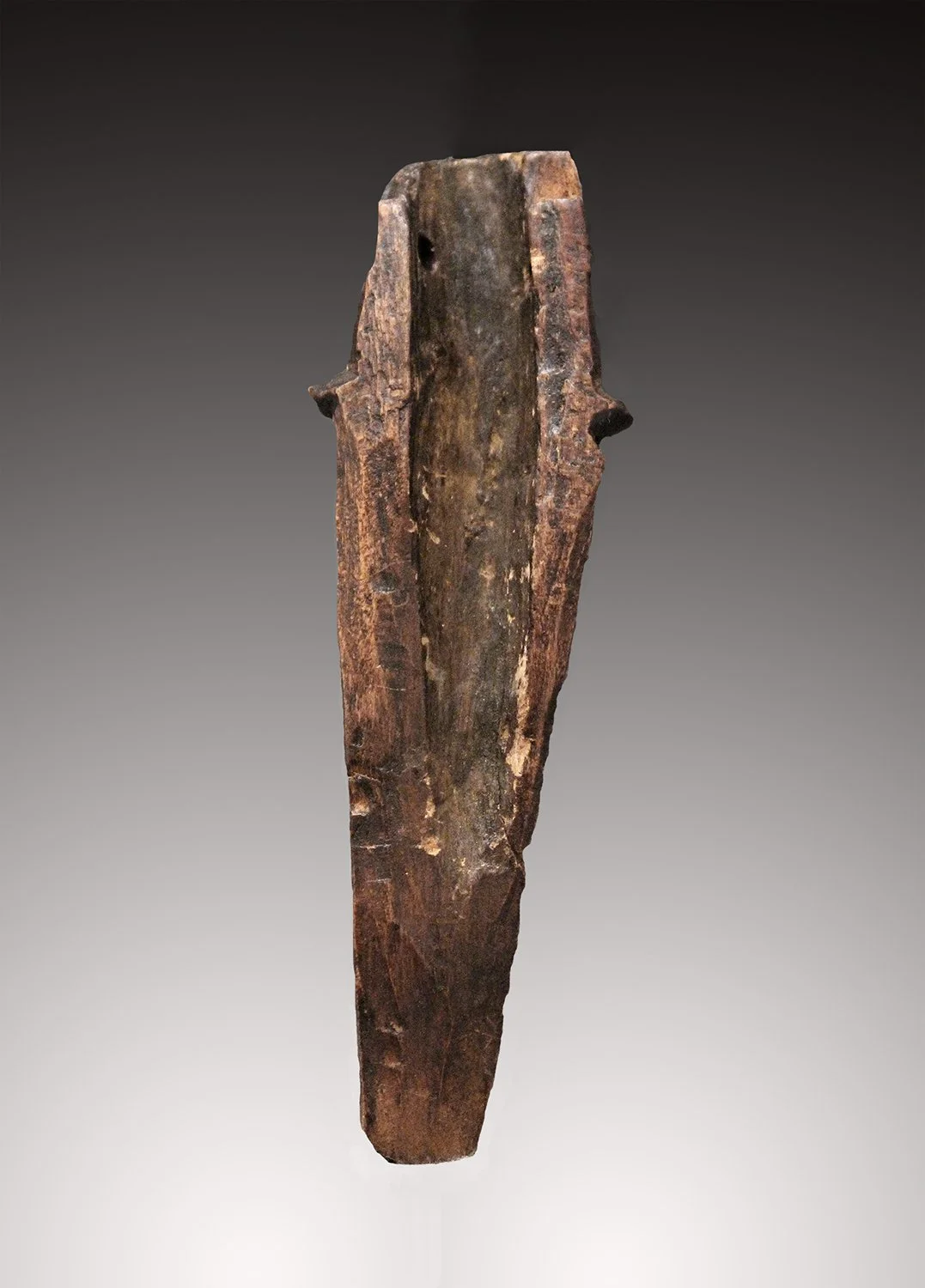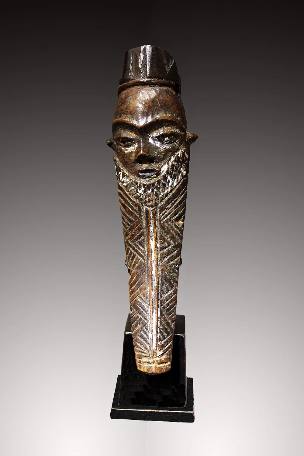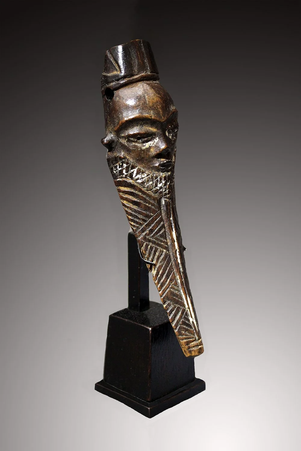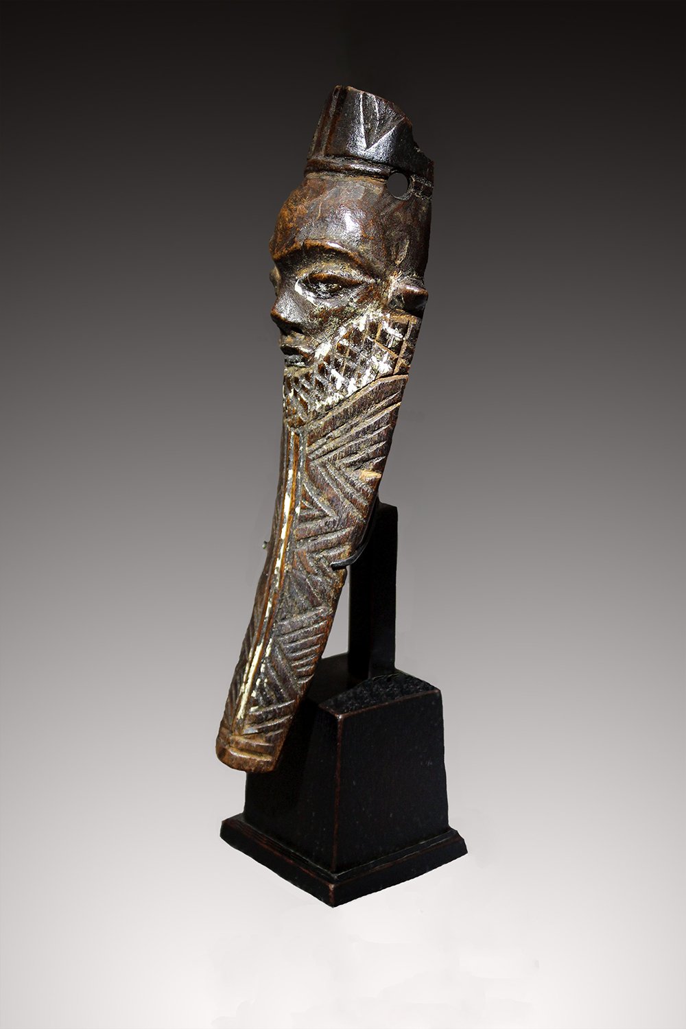 This Pende Ikhoko amulet made of wood is in fine condition with some loss on the back from use. The amulet has a heart-shaped face, downcast eyes, arching brows, triangular nose, a long beard and a dark brown patina with white highlights. Amulets were given to young initiates to serve as a protective tailsman and to reinforce societal morals and values.