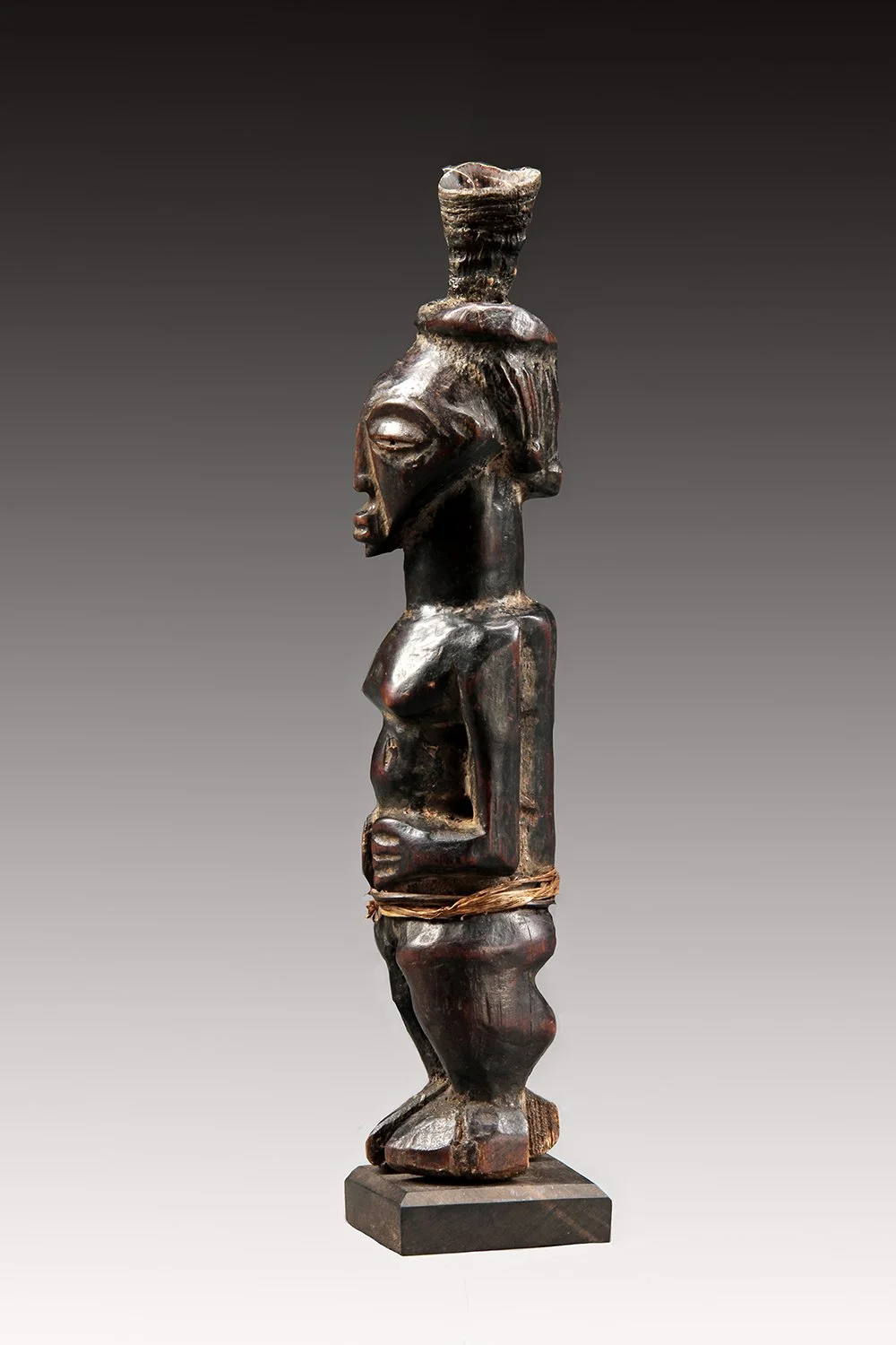 Songye fetish figures were used as an effective instrument for healing, fertility and protection from evil spirits, sorcerers and hostile powers. The figure is in good condition with some loss to the feet and an age crack along the left side. The fetish has a magical animal horn set into the crown of it’s head, hands to the abdomen and a rich reddish brown patina.