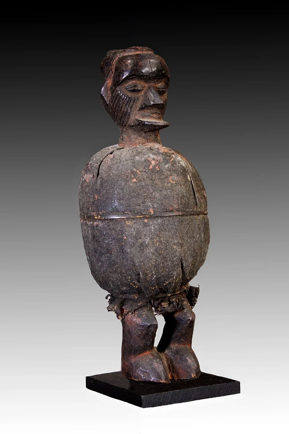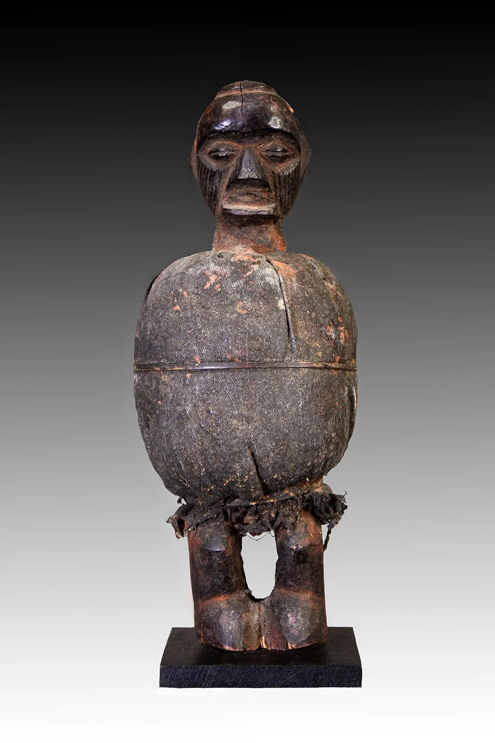 This quality, Teke power figure was used as a magical charm by a ritual specialist in divination, for protection against sorcery, and to counteract harm. The figure is in fine condition with a fetish mass bundled with a cloth mantle with tukula red powder and entwined with leather.