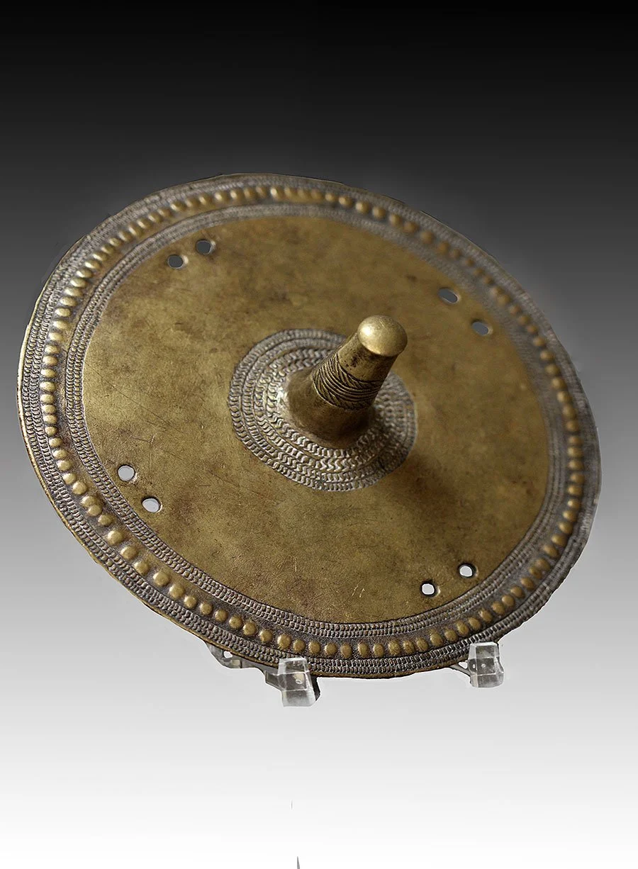 The Borana people used brass ornaments to decorate ceremonial outfits and used as currency for barter. Our Borana brass ornament is disc shaped like an Ethiopian shield with a large projection in the middle with raised dots and incised patterns around the perimeter and sets of holes that were attached to straps.