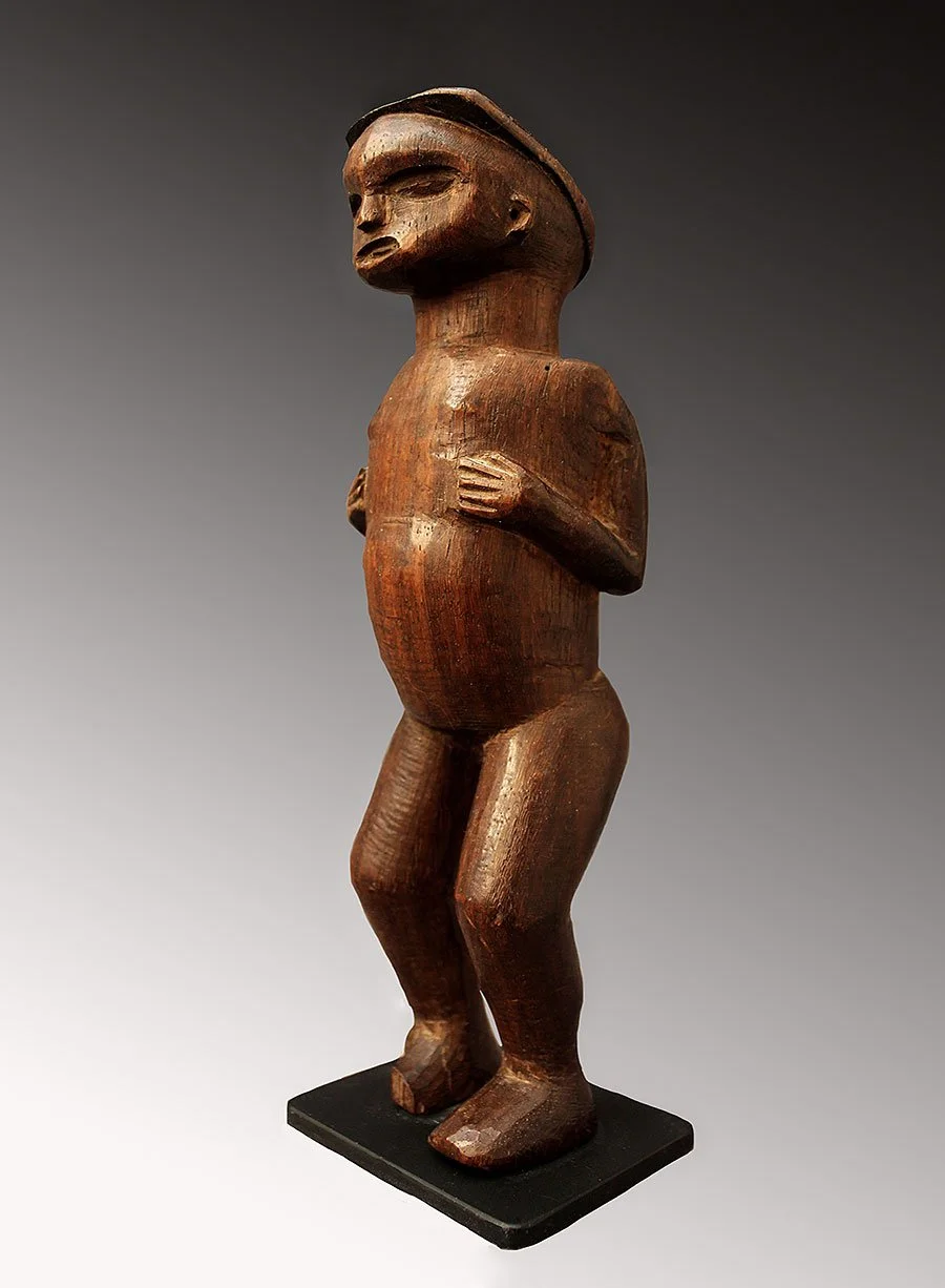 The Chokwe carved small wooden figures which belonged to individuals who used them to honor personal or family spirits. This Chokwe ancestor figure was kept in a shrine to secure spiritual support in sustaining personal wealth and social status. This figure is carved with great attention to detail with legs slightly bent, arms close to the body with hands resting on the chest.