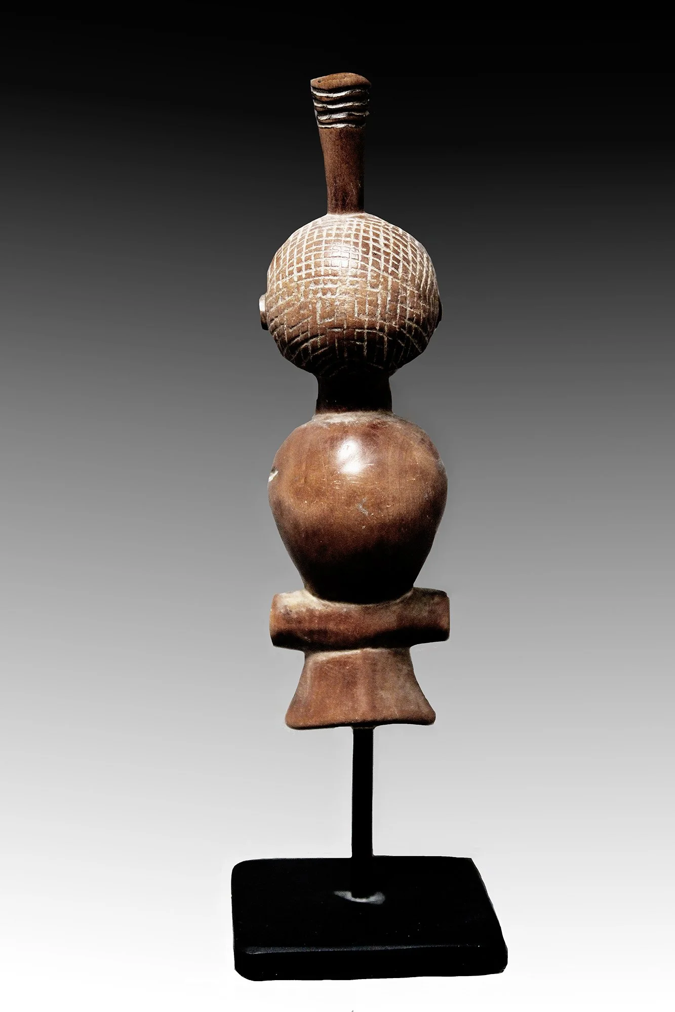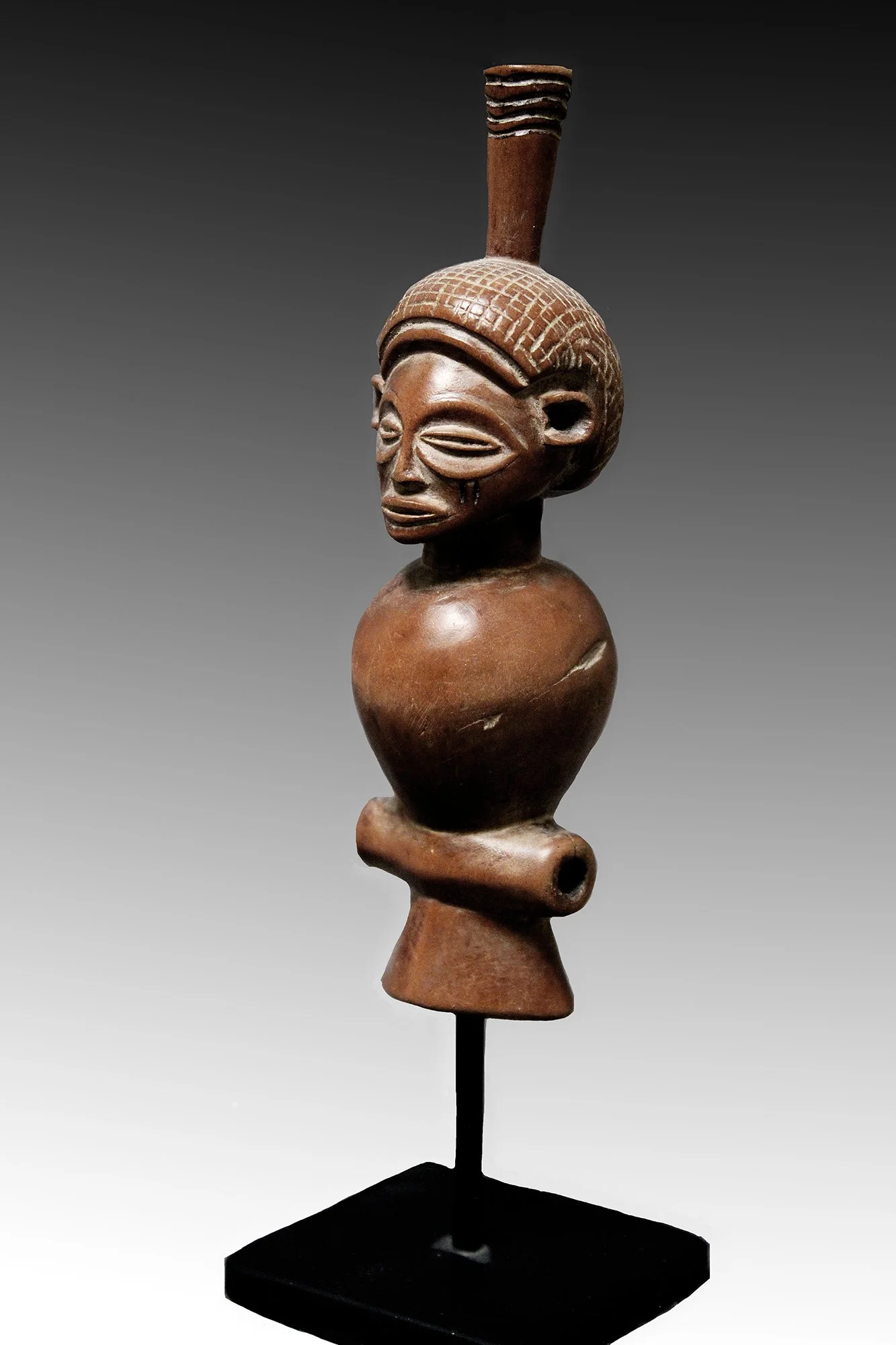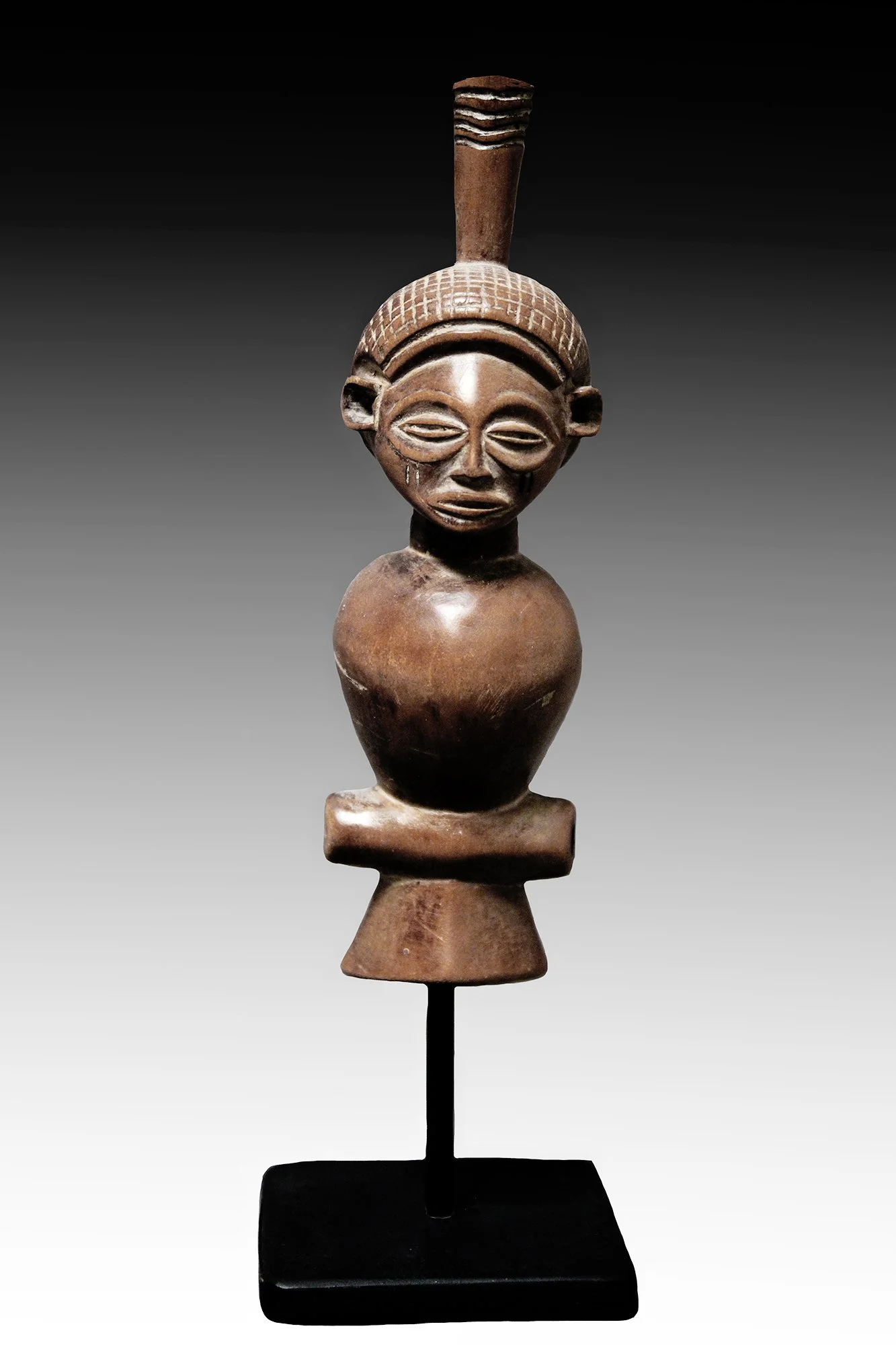Chokwe figurative carved whistles were prestige objects belonging to hunters, war chiefs and other people of social rank. Whistles were used for messages during hunts, war or secret societies. This whistle represents a chief or ancestor with an ovoid body, horizontal mouthpiece and stylized headdress with a horn.