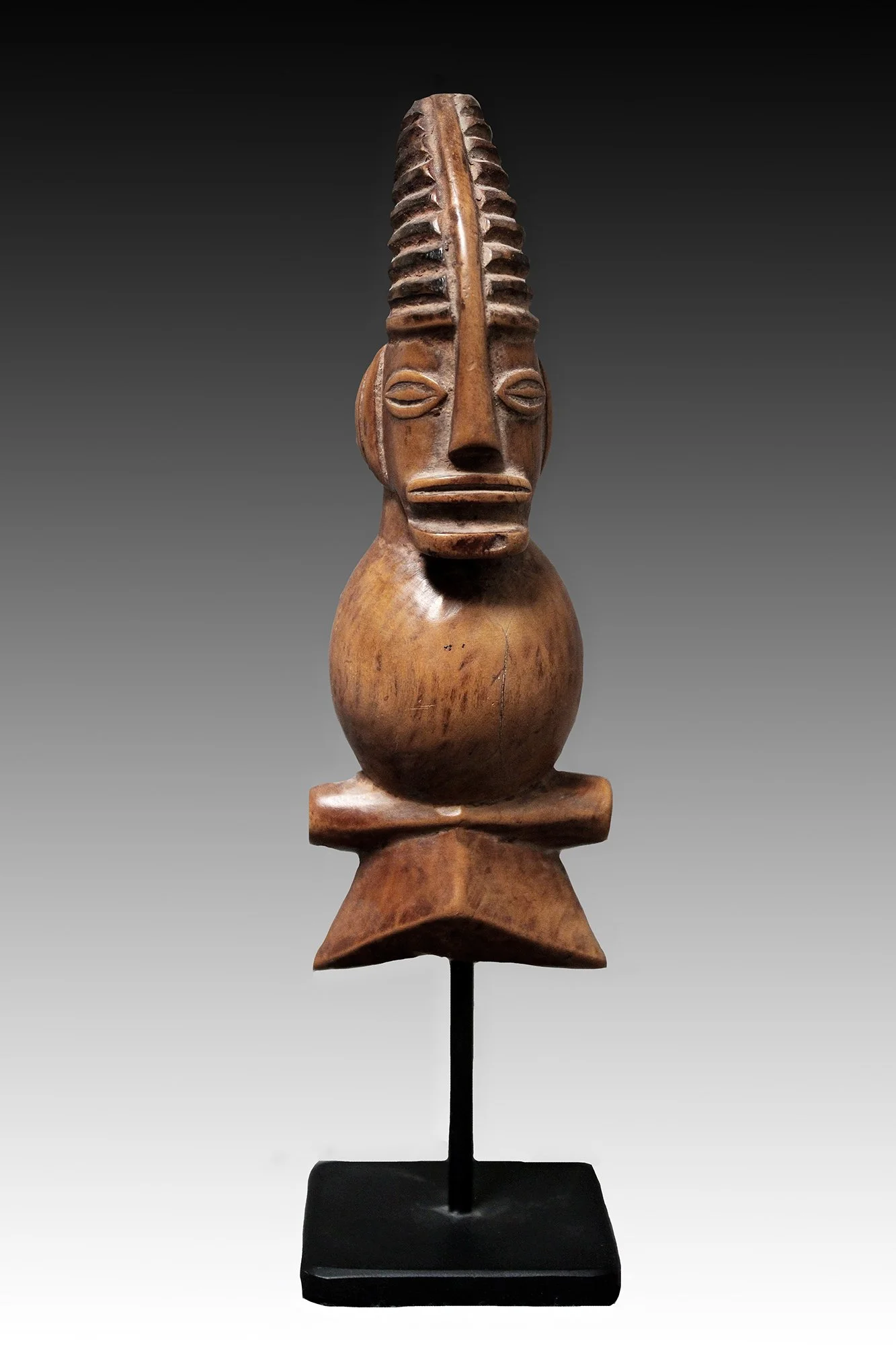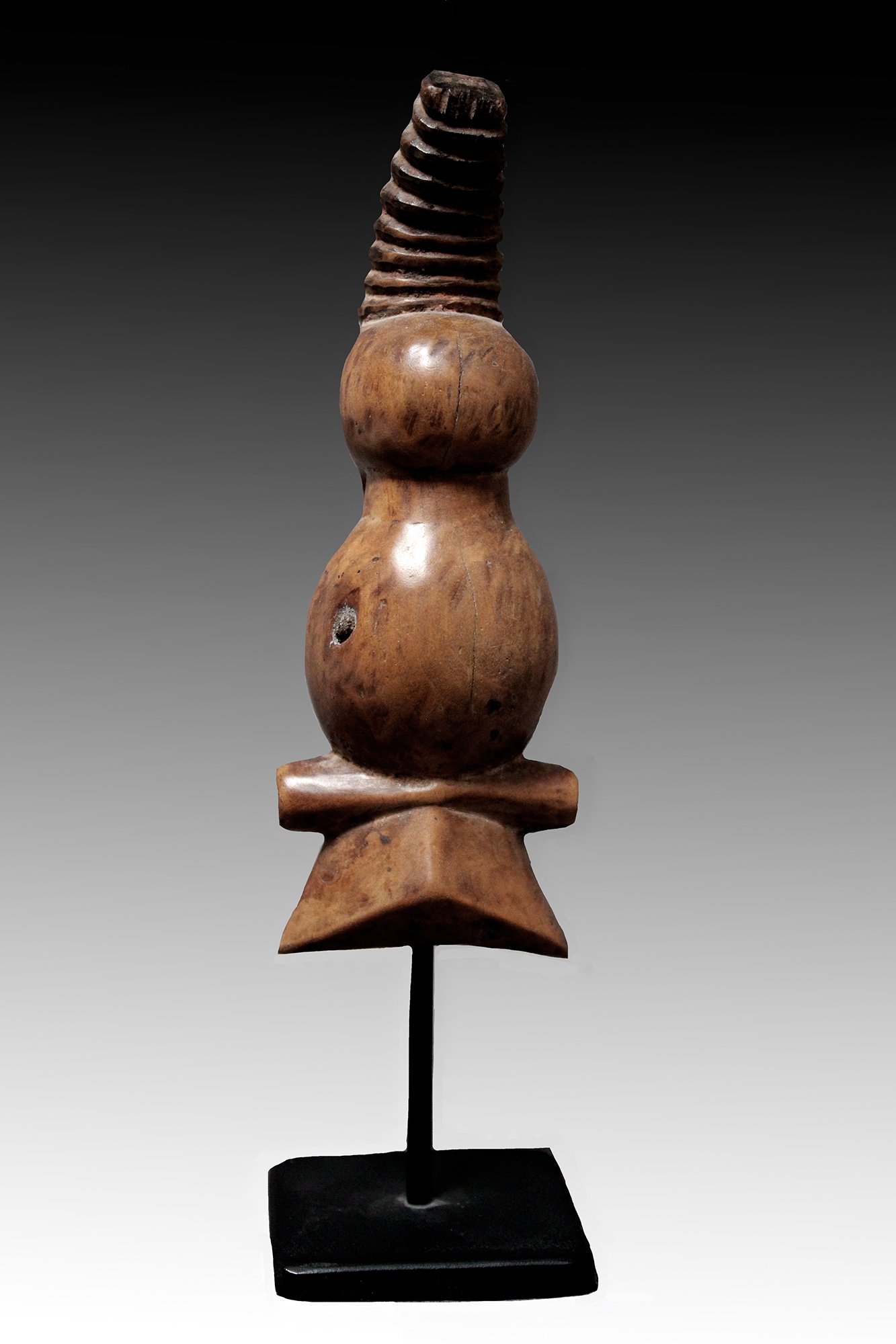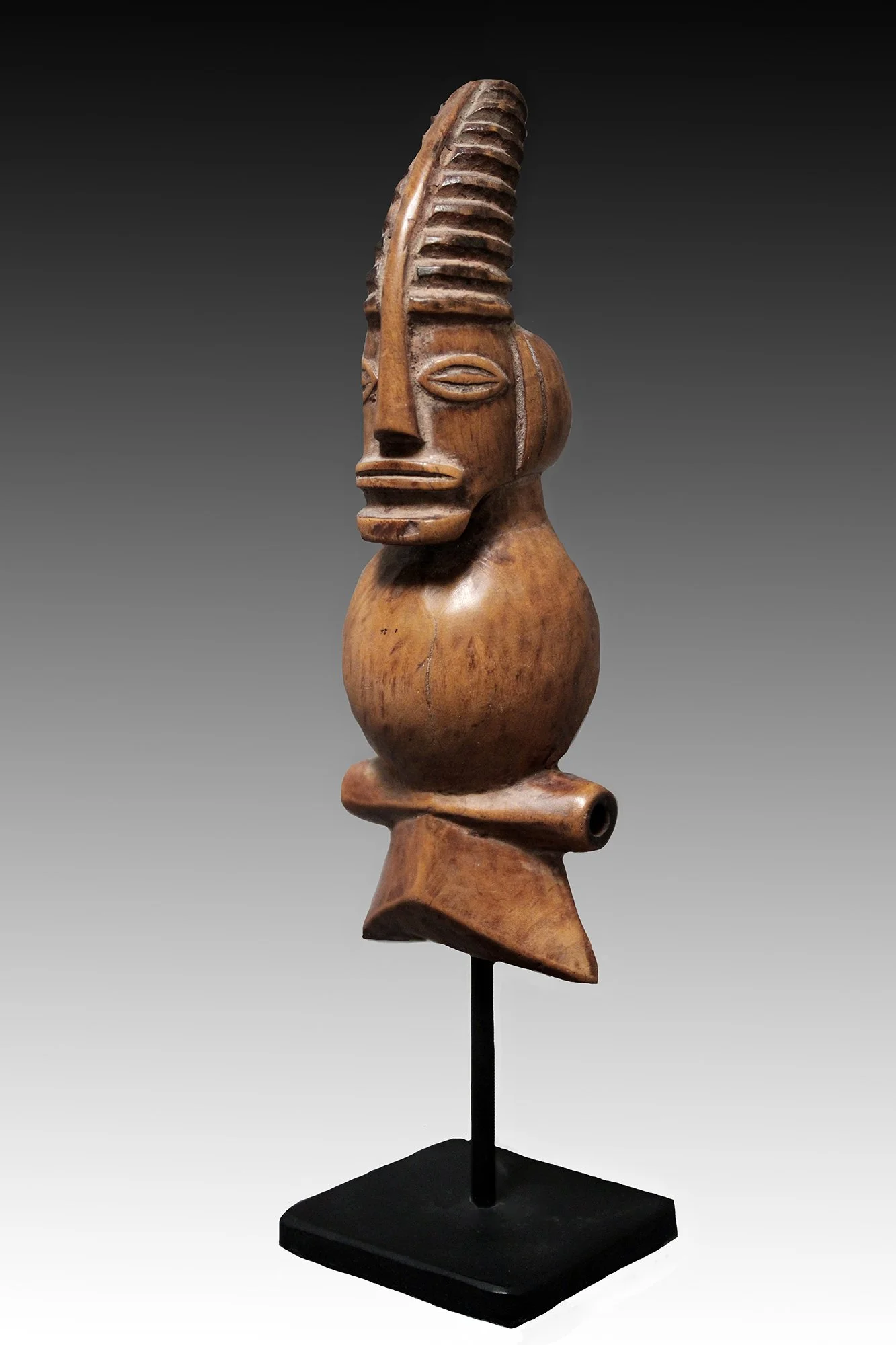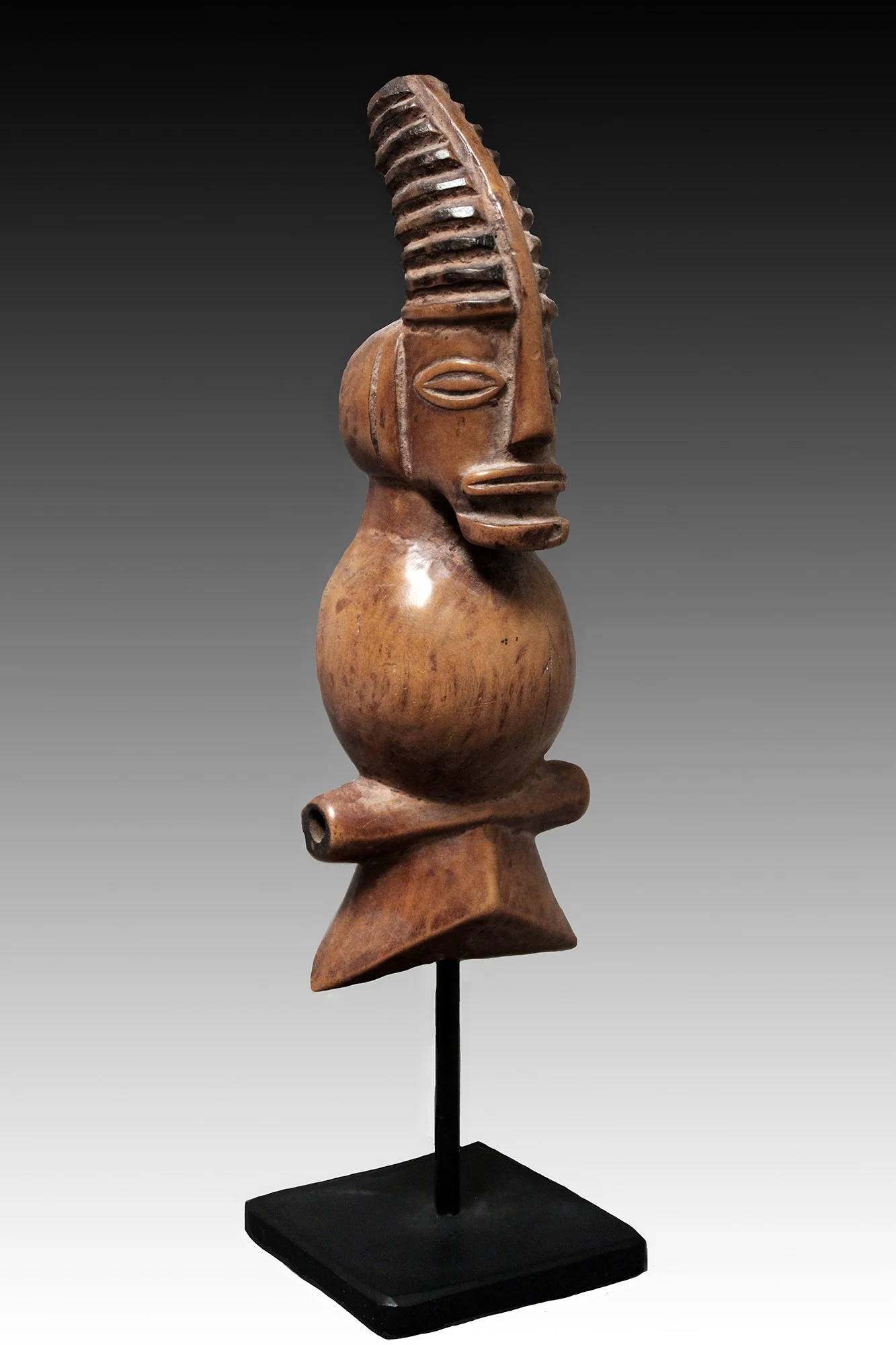Chokwe figurative carved whistles were prestige objects belonging to hunters, war chiefs and other people of social rank. Whistles were used for messages during hunts, war or secret societies. This whistle is decorated with a Cikunza headdress associated with the Mukanda circumcision ritual with an ovoid body, flared mouthpiece and a projecting antelope horn that symbolizes power and virility.