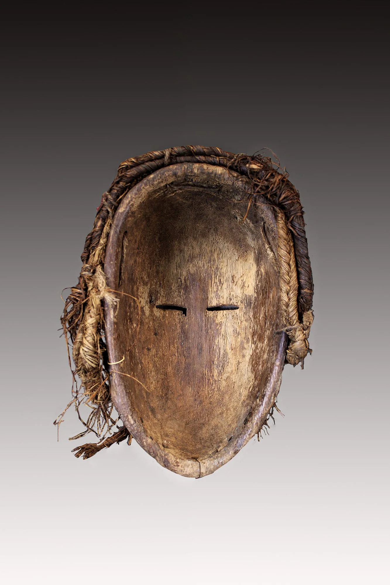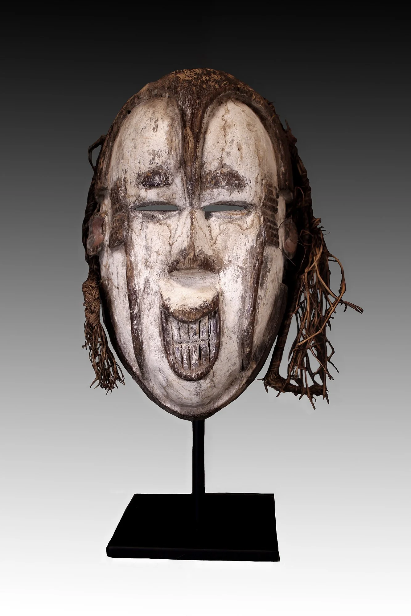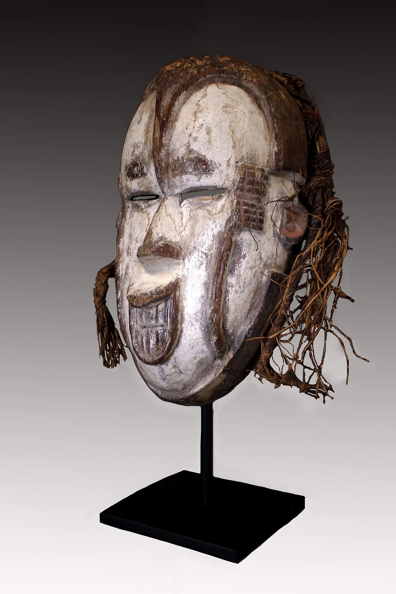 This rare Igbo Okoroshi Oma mask is highly naturalistic with raised forehead, open mouth, baring teeth with white pigment accented with brown keloid decoration. This Igbo Okoroshi mask was danced during agricultural seasons, blessing yam crops and protecting pregnant women.
