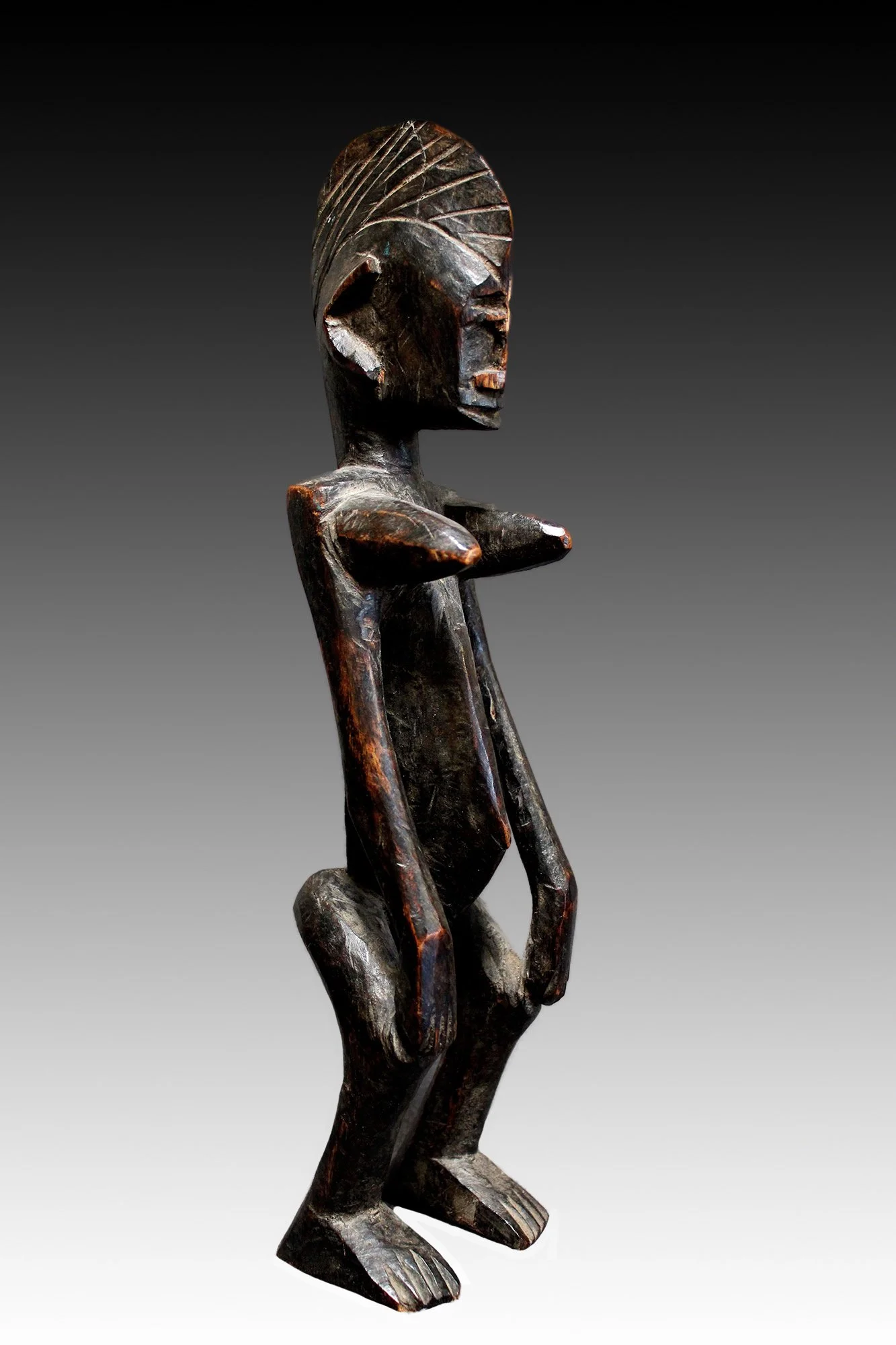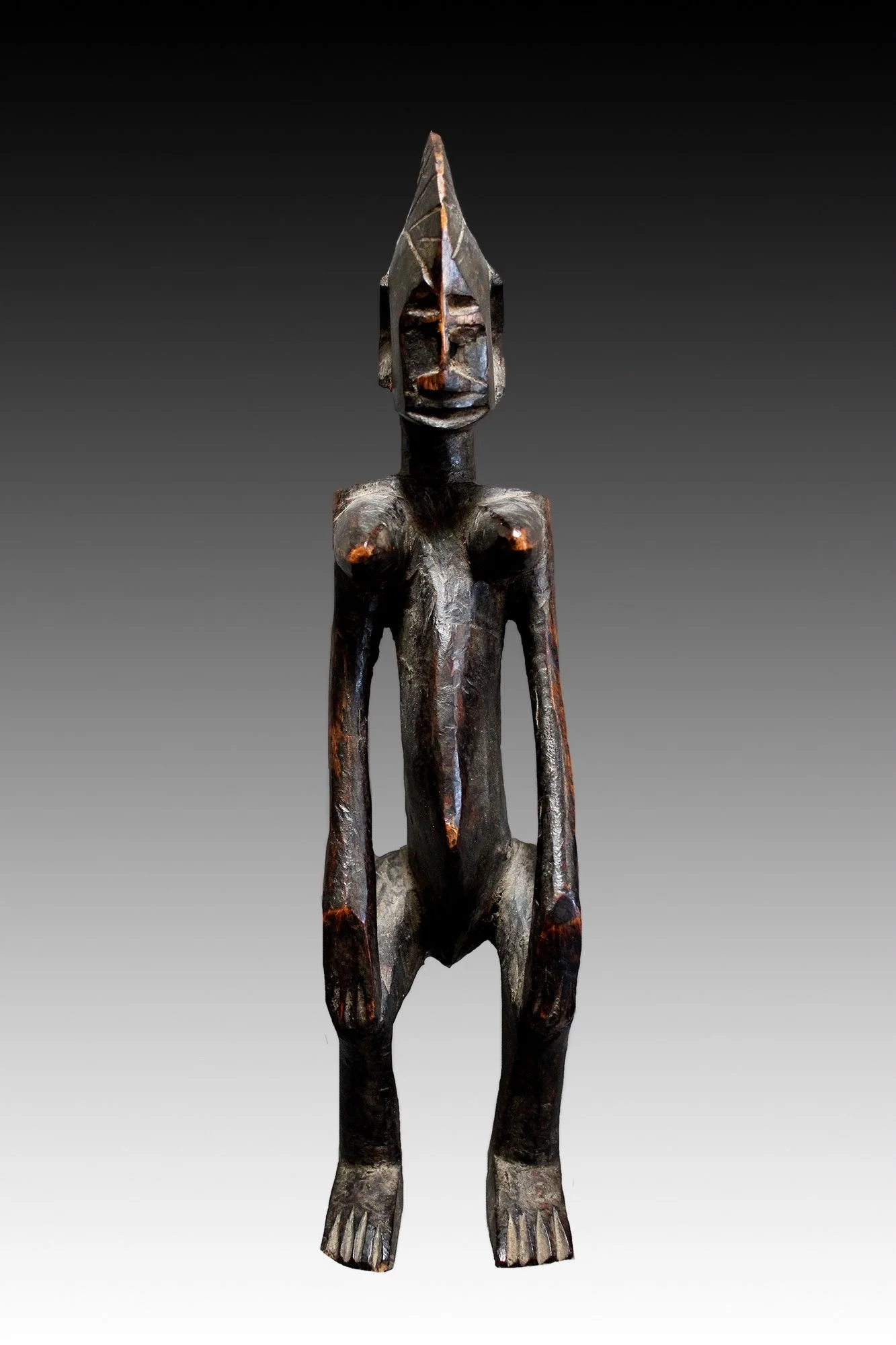 Bamana Jo figure represents a young girl in her ideal state of physical attraction. These Jonyeleni figurines were used during initiations to help maintain cult values and social order. New initiates would take their figures to neighboring villages to advertise their new adult status and their desire for marriage.