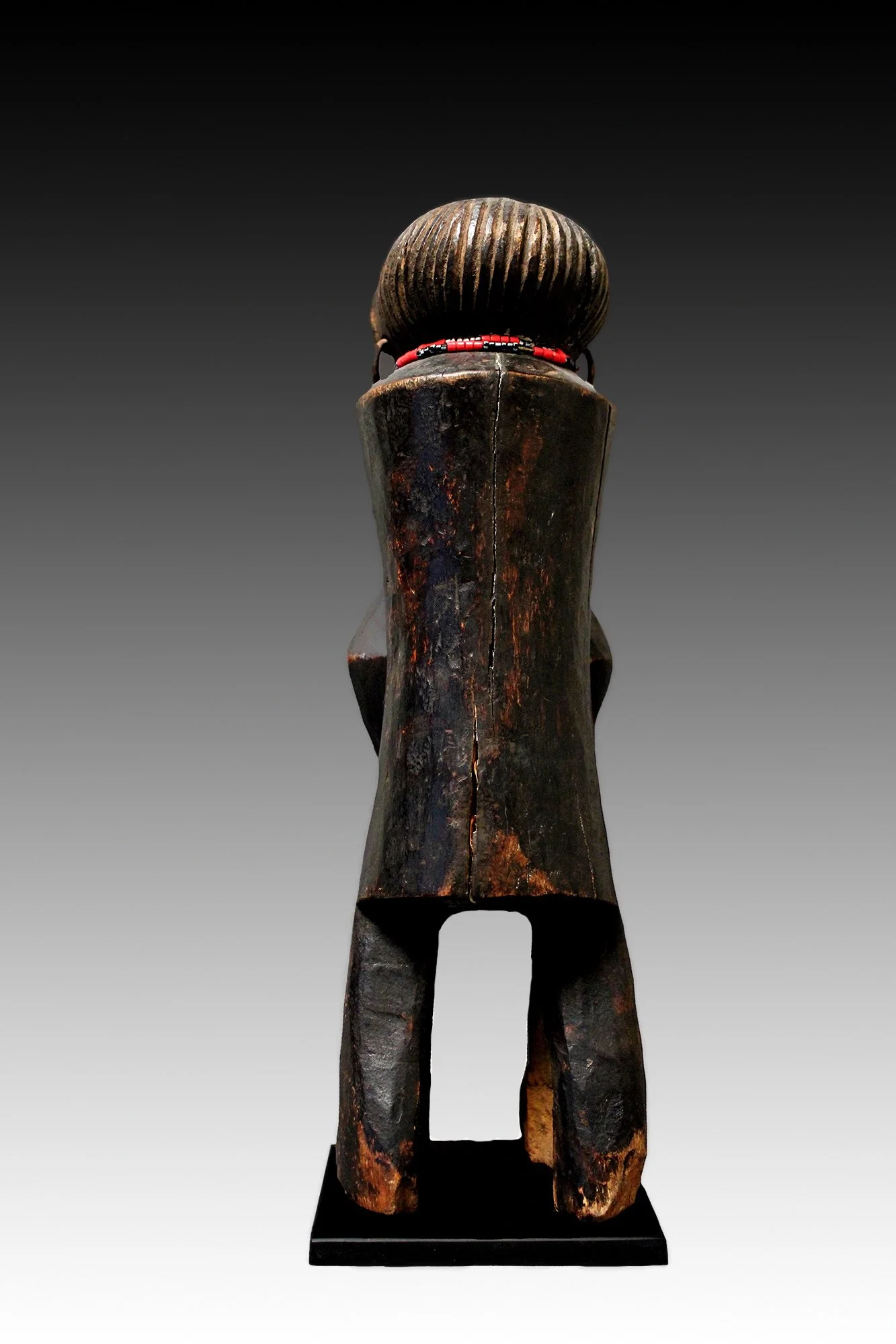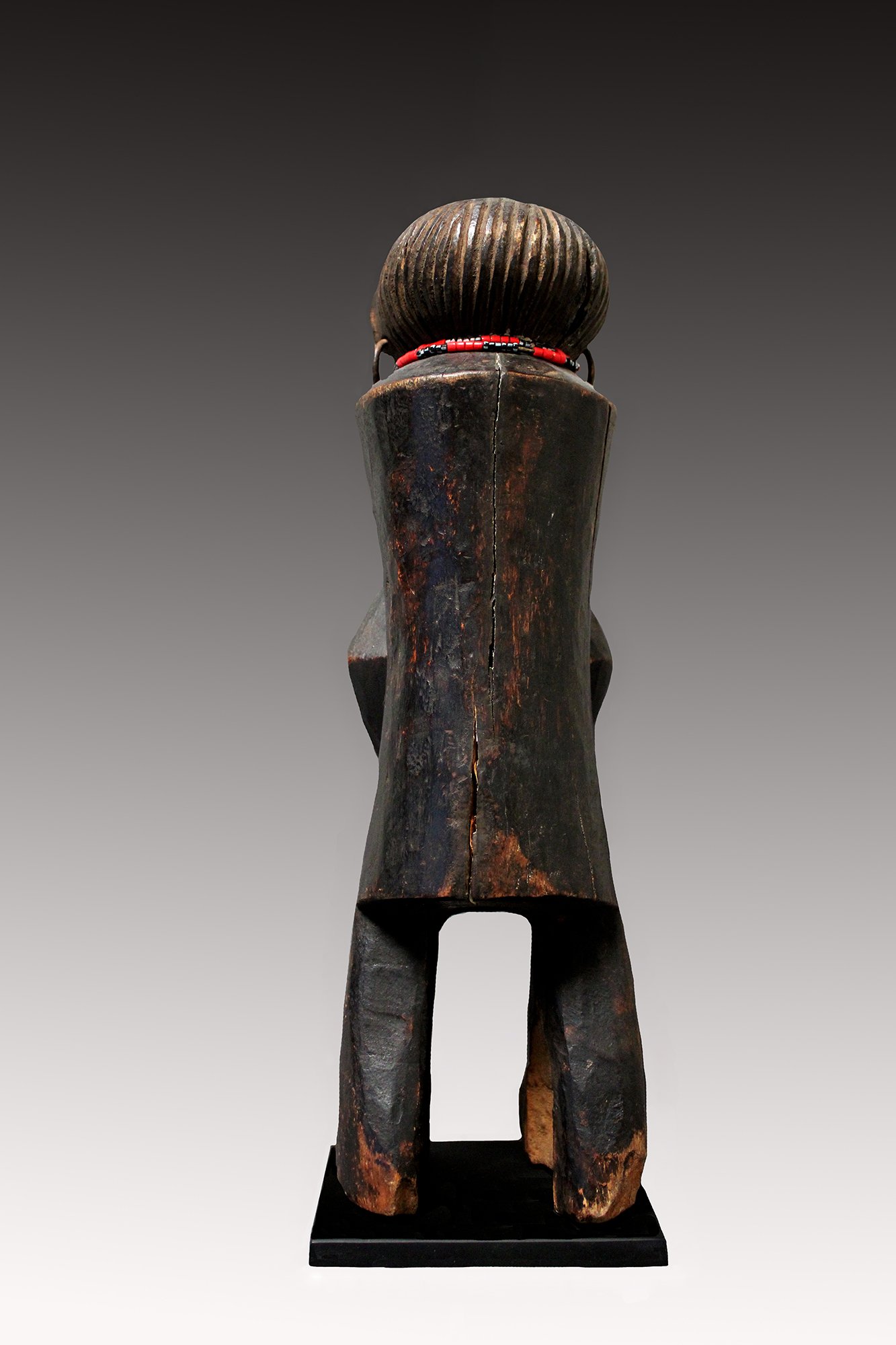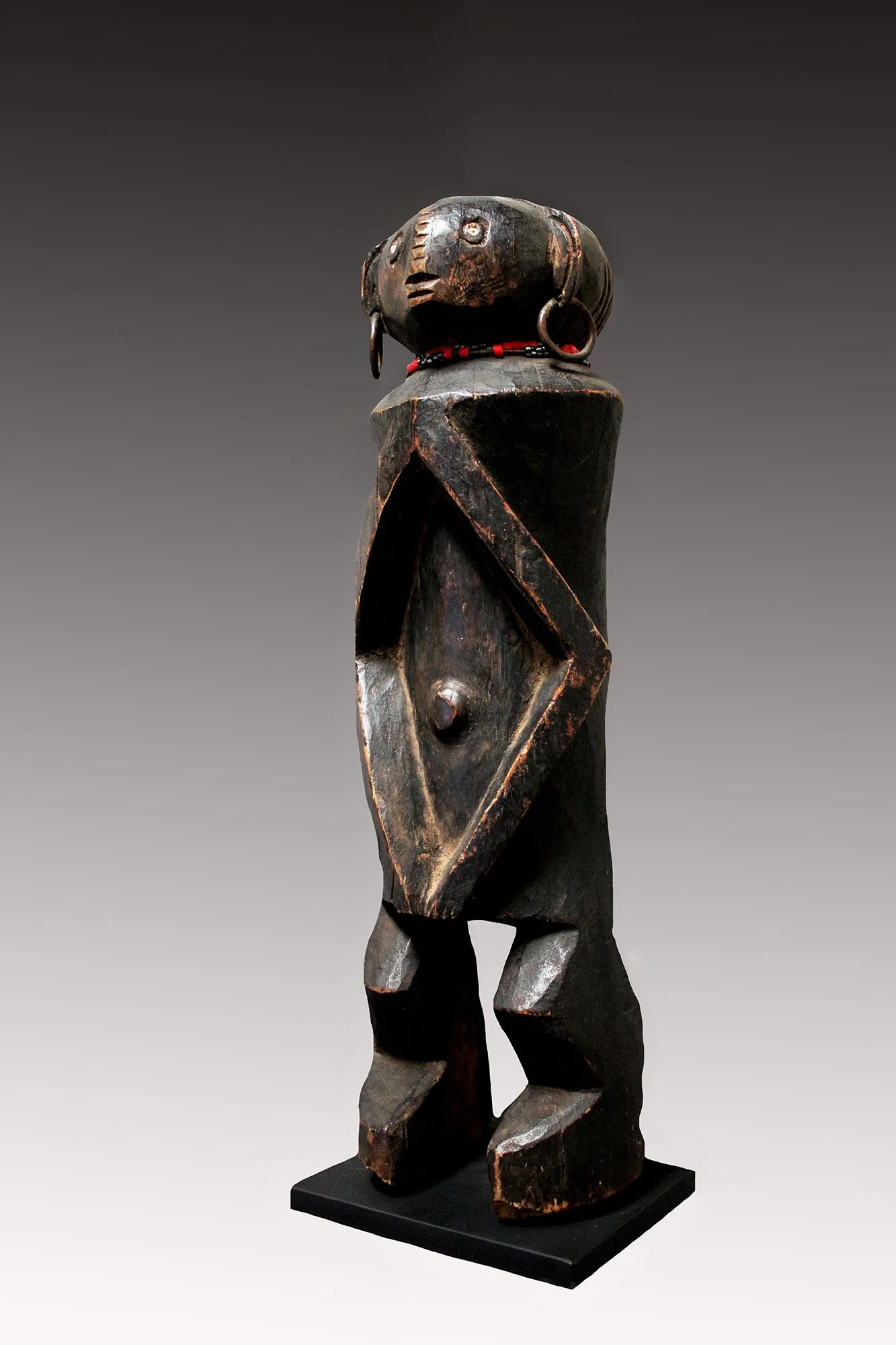 Due the wide migration of tribes in the Ubangi region, there was a diffusion of art styles and artworks that were intermixed across cultural boundaries. This Banda figure was a protective spirit used for social control, successful hunting and to ward off illness. The figure has a cylindrical torso with bent arms forming a lozenge and short bent legs. The head is ovoid shaped with shell eyes, scarification from the forehead to nose, metal rings in the ears and wears a glass beaded necklace.