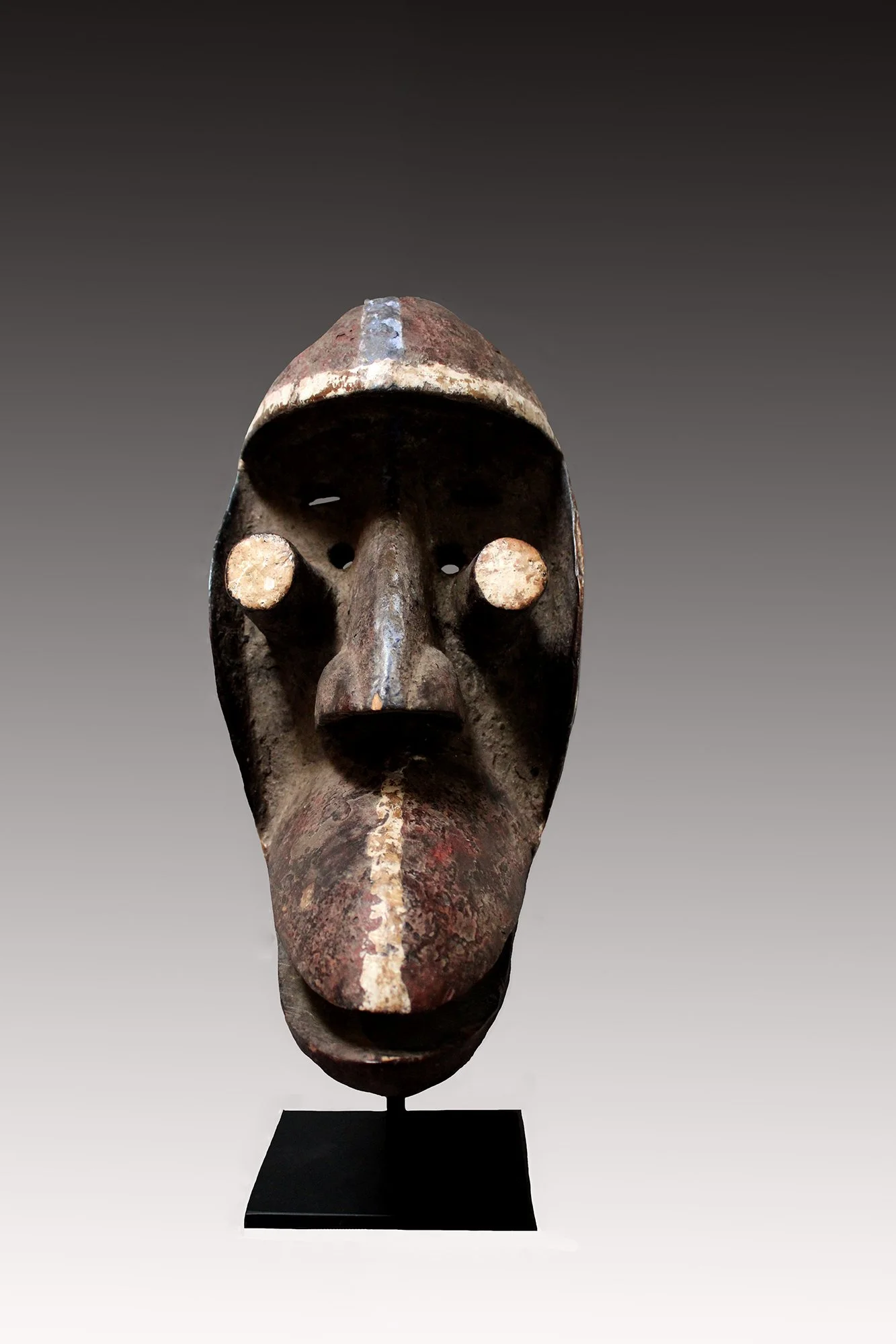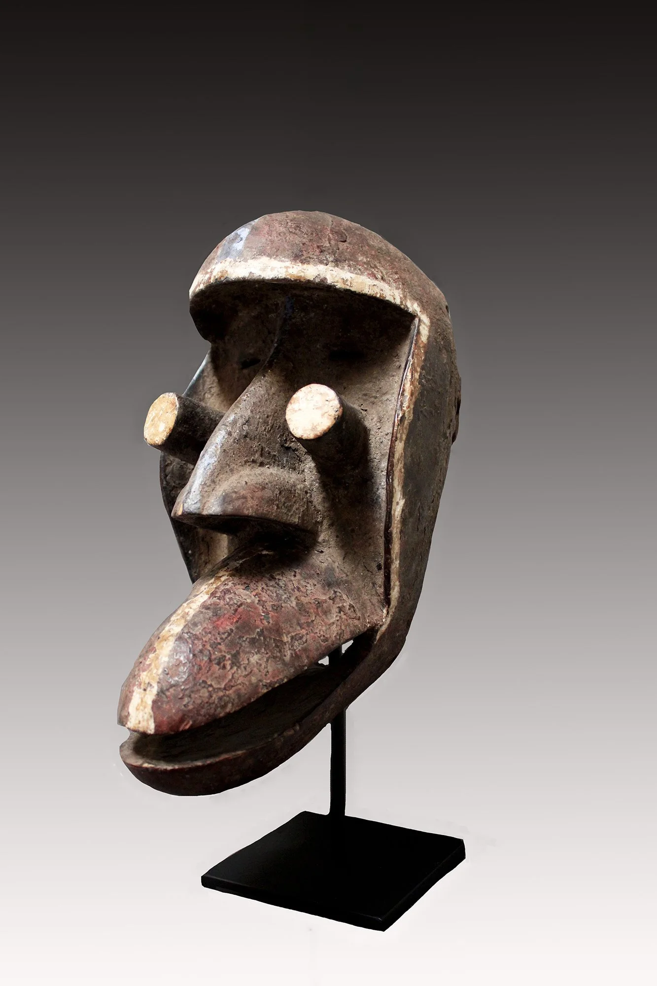 Kran masks were thought to be manifestations of forest spirits. Associated with secret societies, these masks were used as agents of social control, protection against illness, death and poor crops. This mask has a zoomorphic structure with visor-like forehead, strong nose and tubular projecting eyes. There are four eye slits for seeing, open mouth and distinctive use of white and blue pigments.